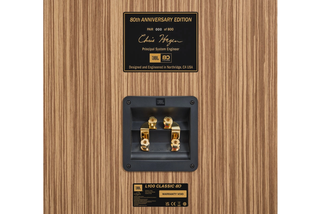 Limited to 800 units, the JBL L100 Classic 80 is finished in a beautiful natural California oak wood veneer and paired with a vintage-inspired brown Quadrex foam grille accented by a gold-and-black JBL logo, the JBL L100 Classic 80 is as visually striking as it is acoustically capable. The design is further distinguished by a black cone 12″ woofer, selected specifically to complement the warm oak finish and brown grille, along with a black satin wood baffle frame and anniversary edition badging on both the front and rear. Together, these elements reinforce its status as a design statement as much as a high-performance loudspeaker.