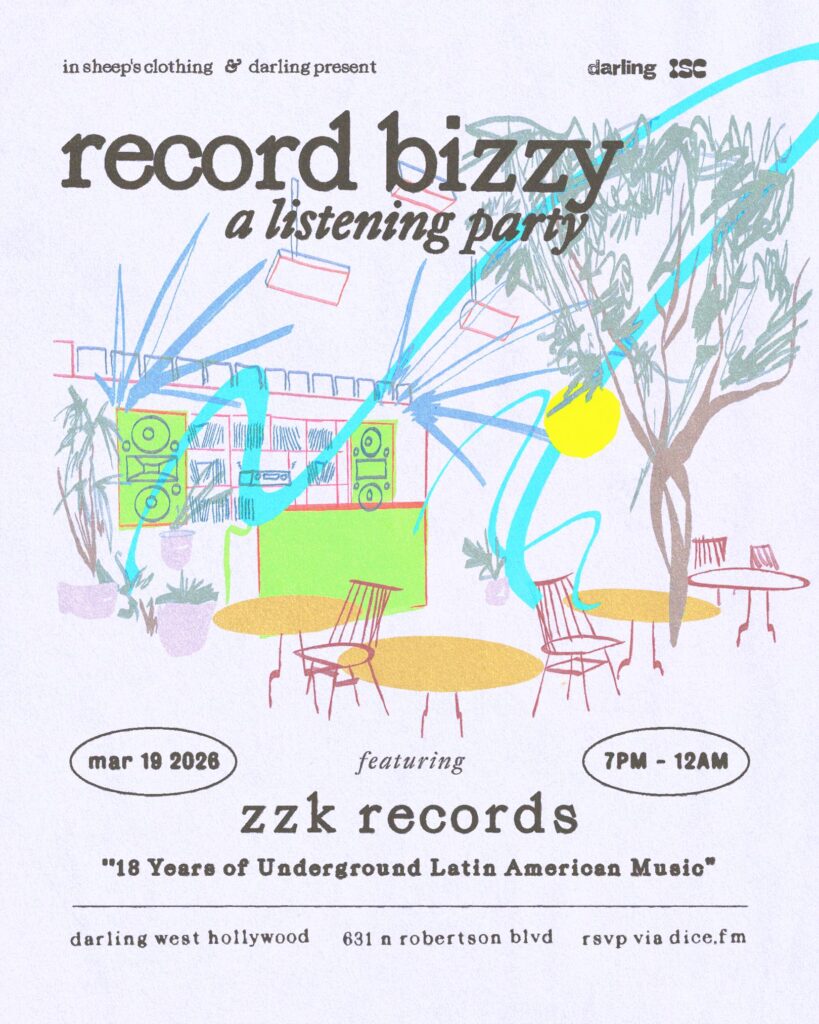 As a part of their 18 year celebration, ZZK Records will be joining In Sheep’s Clothing for our next Record Bizzy listening party at Sean Brock’s beautiful new hi-fi lounge Darling in West Hollywood. Happening at a new time on Thursday, March 19th, the event will featuring album playbacks of classics, favorites, and upcoming releases from the label exploring cumbia, reggaeton, gaita, guajira, and more! Vinyl and merch will be available for sale + full dinner menu until 10pm.